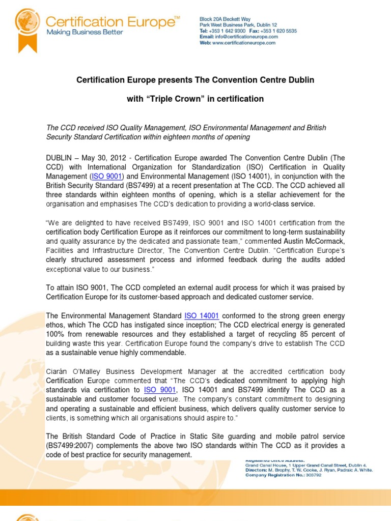 Certification Europe Presents The Convention Centre Dublin With